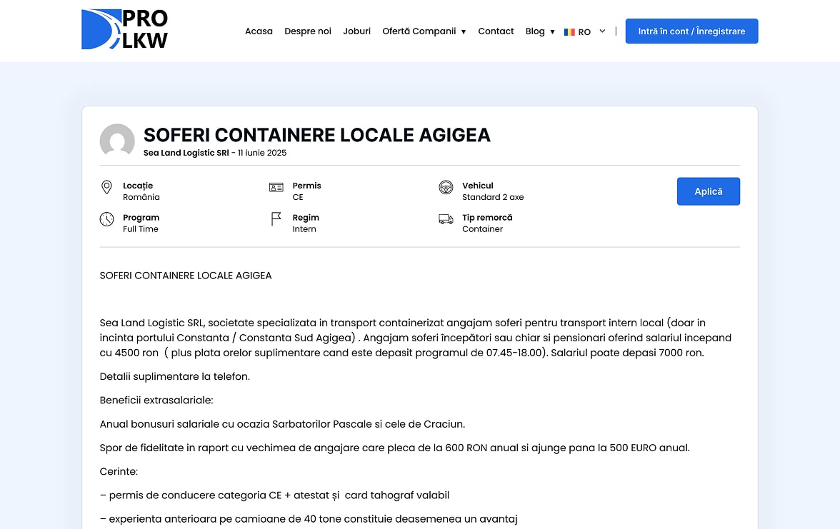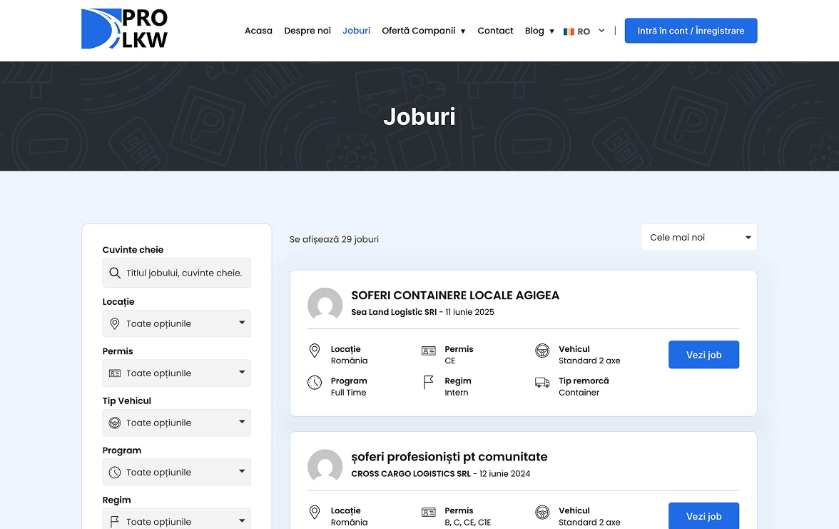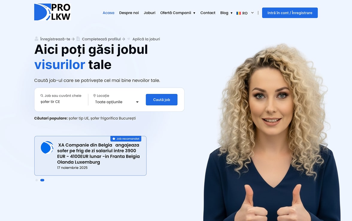 Colaborarea cu PRO LKW ne-a aratat un brand dedicat conectarii profesionistilor cu oportunitati de cariera in transportul international si companii din Europa. PRO LKW sprijina candidatii in gasirea unui loc de munca potrivit, sigur si corect platit, oferind in acelasi timp clientilor solutii de recrutare personalizate si eficiente. Experienta lor combina expertiza in headhunting, consiliere profesionala si tehnologie AI pentru optimizarea procesului de selectie.