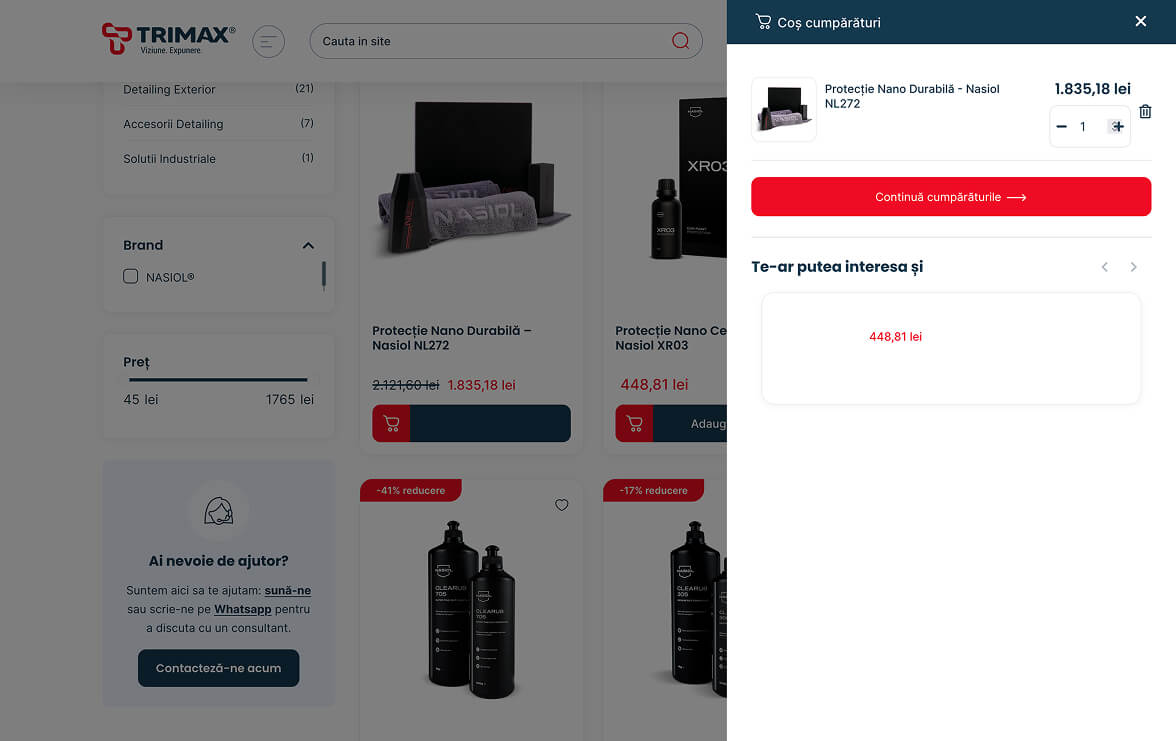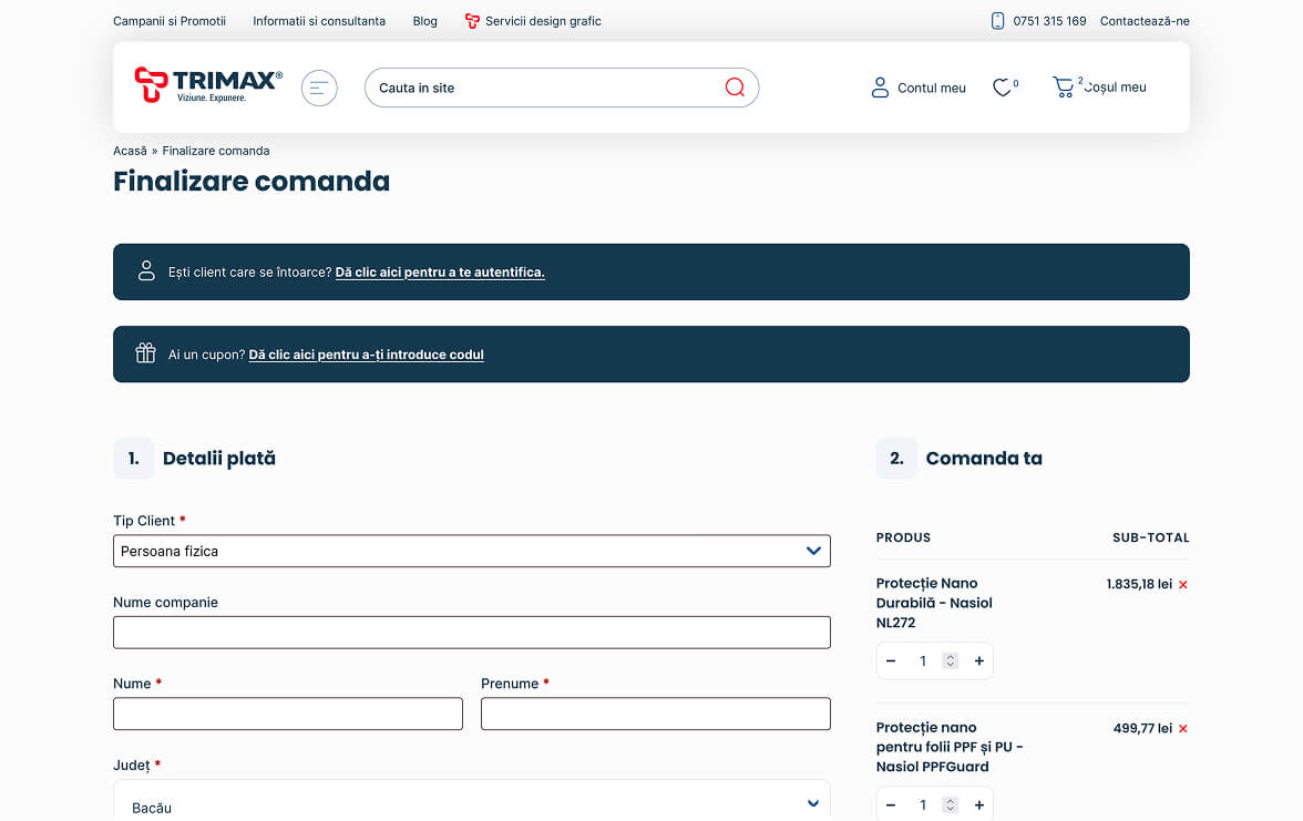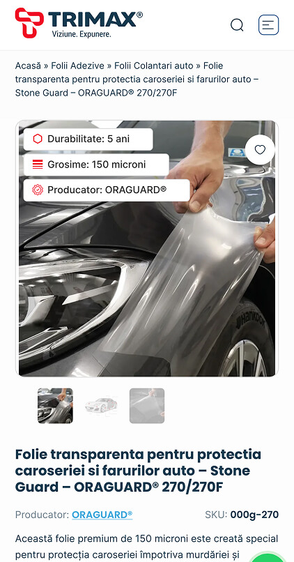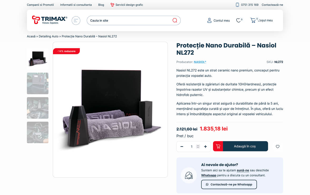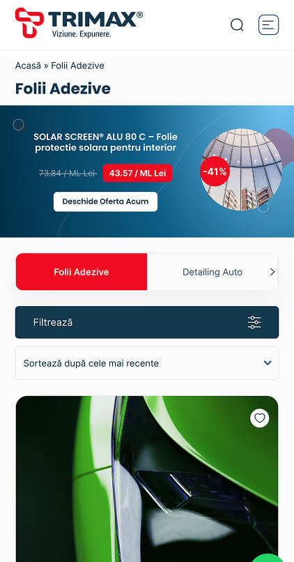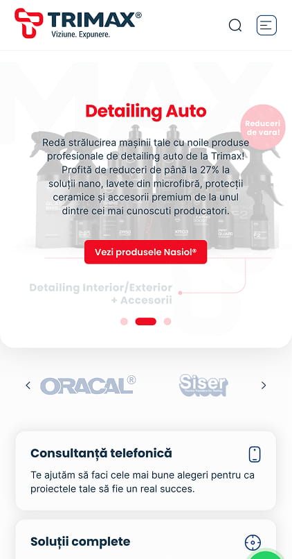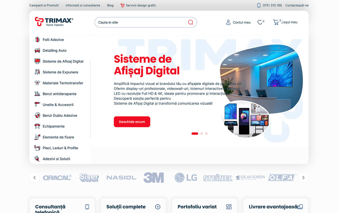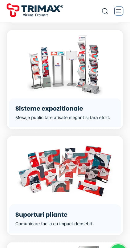 Website-ul Trimax este construit pe o structura complexa, dar clara, care organizeaza un volum mare de produse in categorii bine definite si usor accesibile. Designul este functional si orientat spre utilizator, cu accent pe lizibilitate, iconografie clara si diferentiere vizuala intre gamele de produse. UI-ul este gandit pentru eficienta, permitand navigare rapida, acces facil la informatii tehnice, CTA-uri vizibile si filtre care ajuta utilizatorii sa identifice rapid solutiile potrivite. Experienta este optimizata atat pentru desktop, cat si pentru mobil, sustinand un parcurs logic de la informare la conversie, fie ca este vorba despre achizitie directa sau contact comercial.