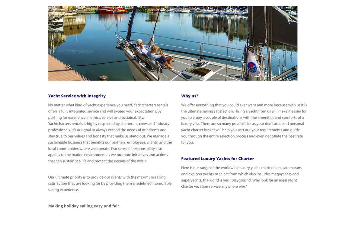Proiectul Yacht Charters a reprezentat o provocare pentru noi deoarece stiam ca trebuie sa le cream un website atat de bun, incat oamenii sa-si imagineze cat de grozav ar fi daca ar apela la serviciile lor.